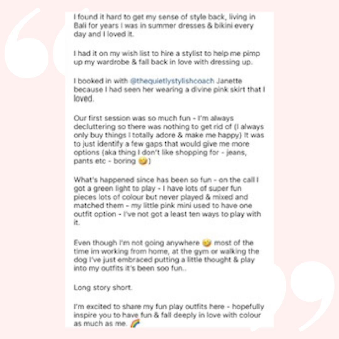We will work together on a 1-2-1 basis, where I will take you through my proven 7 step style roadmap starting with how you see yourself and how you want to look and feel, right through to me creating your outfits for you so you’ll never say “I have nothing to wear” again!